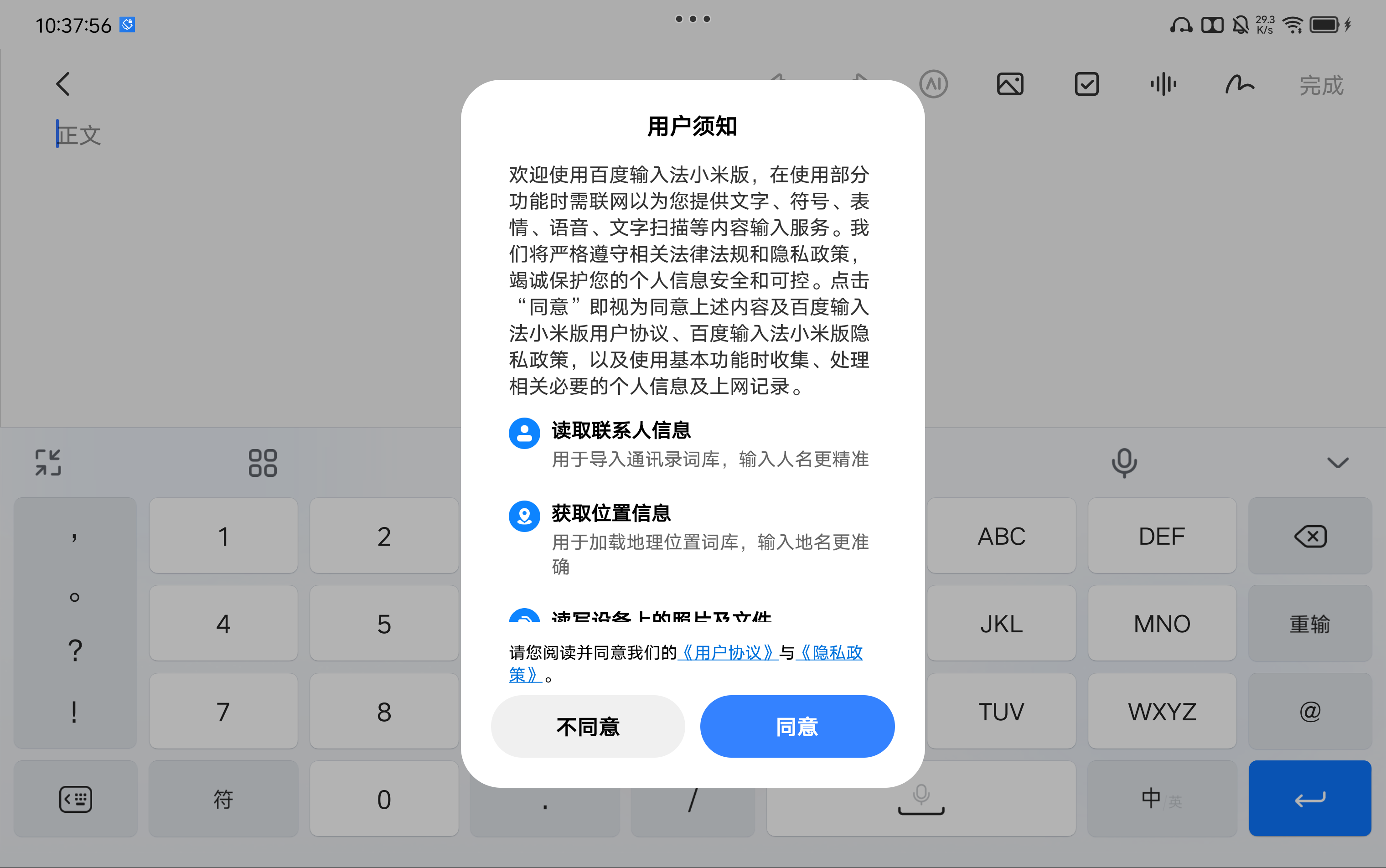小米版中文和原版相同,英文是和 Gboard 一样的实体键盘布局,但在联想平板上有一个 bug,每次弹出键盘都要弹出用户须知: