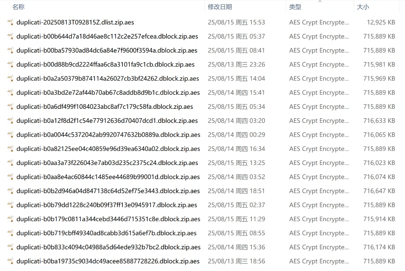- Duplicati 生成的备份文件,必须由 Duplicati 读取,即使它产生的 AES 文件可以通过 AES Crypt 命令行解密,解密后的文件结构也难以恢复,我就是不想绑定这个工具!